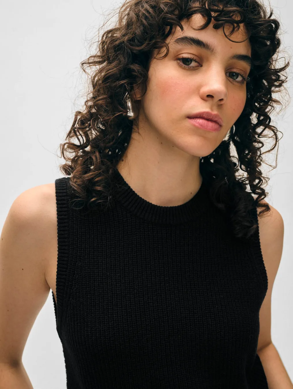 This shell feels more like a contemporary top than a sweater. Crafted from a ribbed cotton blend, it has a straight-fitting silhouette, high-hip length, and ribbed trims. Style it with breezy, billowing pants to stay cool and relaxed this season.